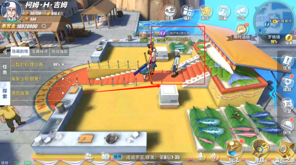 来到鱼店老板后方的右边找到渔夫,看到了山治梦寐以求的(象鼻金枪鱼),问渔夫怎么卖,渔夫说参加比赛拿冠军,说着说着就去旁边赛场报名参加比赛了。