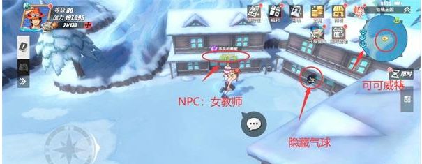 隐藏气球位于“可可威特”最右侧,这里会有一个NPC“女教师”。玩家来到这个位置之后,靠门那个气球就是隐藏气球。20枚金果已到账,请注意查收!