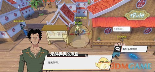 3、我们回到无所事事的海盗这里,和他对话他就会去餐厅工作,这样我们就能通过了。
