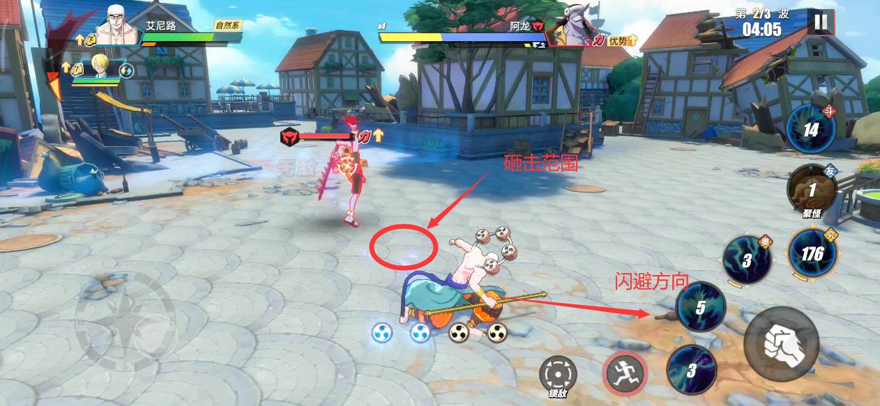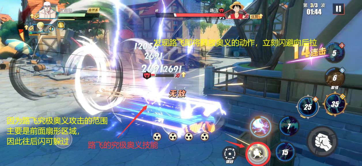 BOSS技能越多,难度也就越大。当路飞上场后,因为我们距离他较远,所以他有可能会直接使用“橡皮·火箭”,大家只要发现他作出冲刺的动作时,我们就往左右两侧闪避开。