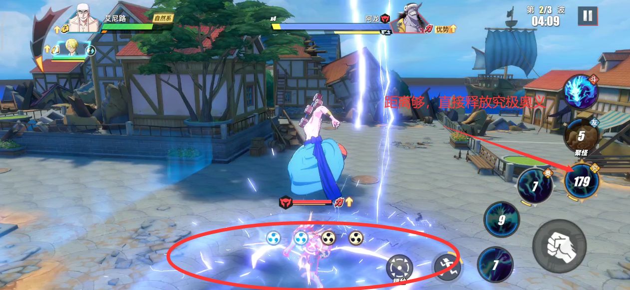我们在与路飞打的时候,因为闪电的影响,有可能会看不清路飞的动作。所以输出时,尽可能轻微向后拉一下,这样不会遮挡住我们的视线,同时有利于躲避路飞的技能。