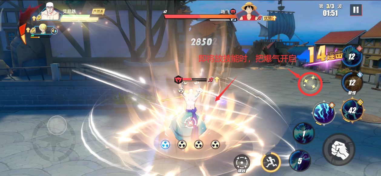 黑足·山智技能打完之后,我们把艾尼路换上场,然后使用鳄鱼的助战技能限制住路飞,接着利用远程技能消耗,最后使用近战技能破盾,随后进行一连套普攻连招。在输出的时候,若我们有爆气,那么可以先开启爆气,然后再使用技能。