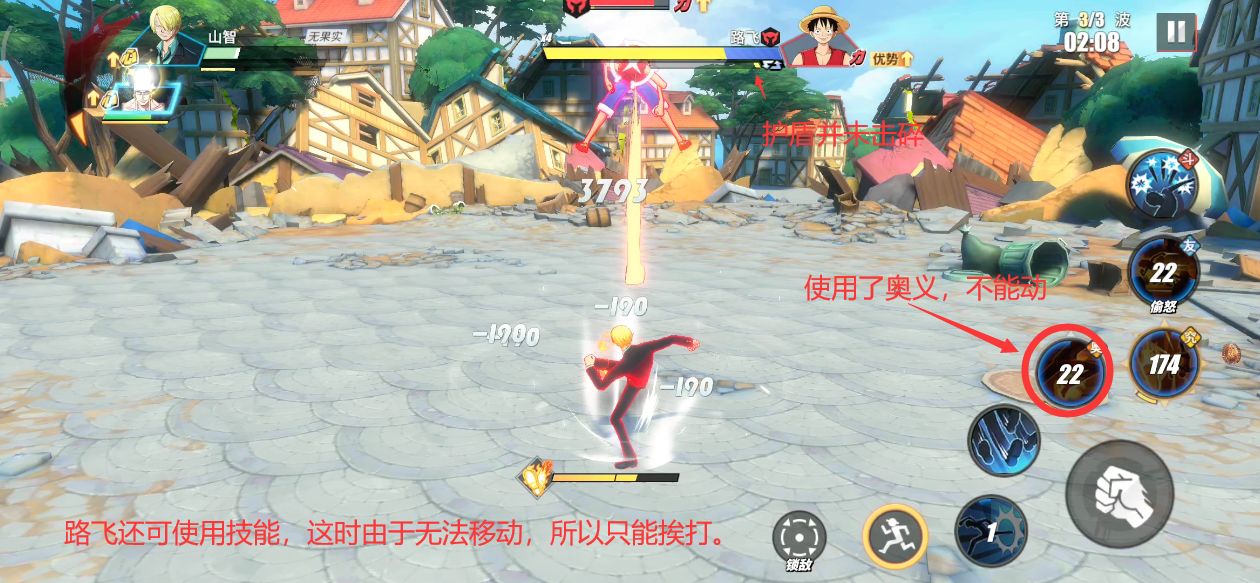老规矩,有究极奥义技能,则先使用究极奥义技能。先将路飞击倒,然后我们再输出。在使用技能输出的时候,大家要注意,若路飞拥有护盾保护,并且我们无法保证能够用本次技能将他破盾的话,不建议大家使用附带停顿效果的技能。如黑足·山智的奥义技能,只要一使用,那我们就是一个不动的靶子。