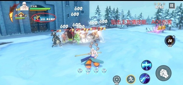 打第三波时,我们可以先将路飞未用的技能用了,然后再替换艾尼路上场。玩家也可以直接提前替换出场,然后利用绕圈的方式聚怪,接着再随意选择技能使用。输出时,除了艾尼路的技能之外,狙击王的技能也别忘记,不仅可造成AOE伤害,还能砸飞区域目标。