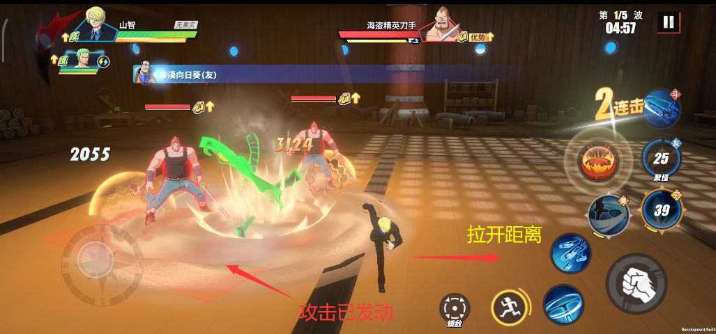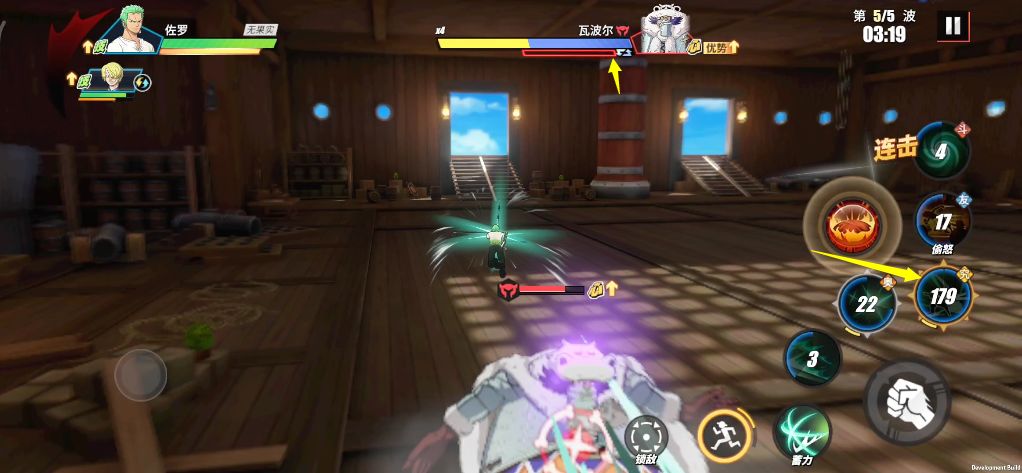 如果在这一波中,大家没有鳄鱼助战的话,那么可以选择一个适宜的攻击方向,然后利用奥义击碎其护盾,之后再打出连招攻击。大家也可以往后方拉扯,然后再选择一个侧面方向移动,这时再使用佐罗的奥义即可一穿多个目标。