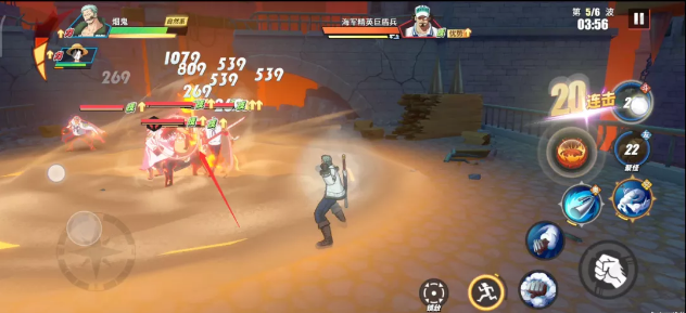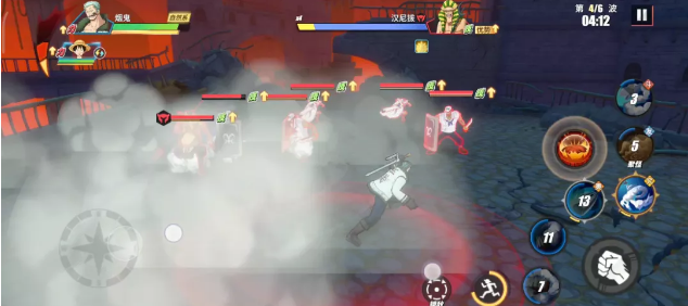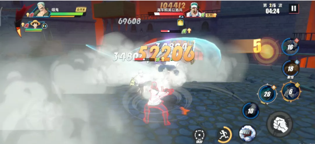 第一波敌人入场后,我们先利用鳄鱼助战限制海军精英巨盾兵的冲撞和移动,然后再利用烟鬼的【白蛇】抓取其一,并砸向怪堆,接着再使用【白色烟拳】、【白色冲刺】、【白色冲击】打出巨额伤害,此时在战力达标的情况下,可以一波秒掉。
