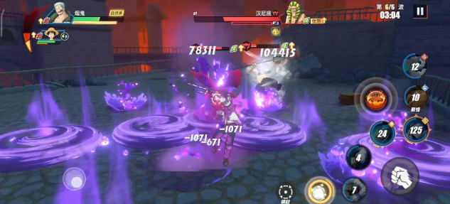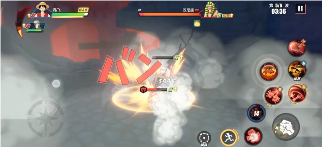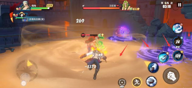 这一波出现的敌人不是很强,只要控制好距离就不会被打到。上一波用烟鬼打完之后,替换路飞登场,然后使用【橡皮·抓】控制汉尼拔,并借这个砸击效果同时打其他敌人。