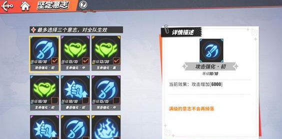 获得的意志加成可自由搭配,玩家每次挑战最多可装备三个,其效果通用于多个挑战玩法。