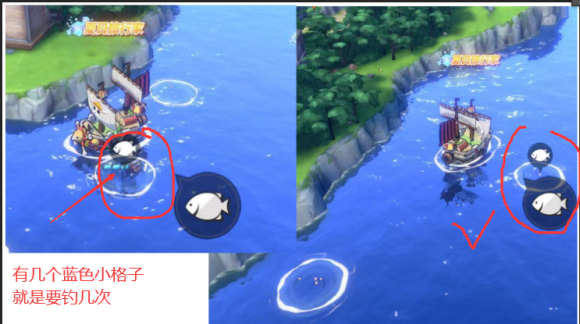 然后来到钓点的位置,每个坑位一般能钓鱼1-4次,可以找那种只需钓一次的钓鱼点,如下图,左边的蓝色小格子有几个就是这个点要钓几次。右边的这种没有小格子就是只要一次就可以完成啦(缺少鱼饵或者不乐意钓的可以选择找一下这种)
