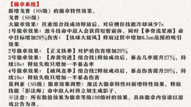 1号徽章效果:激斗技命中敌人会获得短暂霸体,同时[拳骨流星雨]命中目标增加20%伤害。【铁球大旋风】 释放过程中增加6.5M范围的吸引效果。