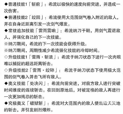 3、技能强度介绍:希流作为前海底监狱看守长,其个体的实力和麦哲伦相当,拥有相当的剑术和实力,是绝对值得玩家配置和培养的。详细的技能机制上,小伙伴们可以参考文章图示。