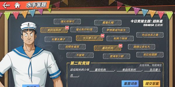 -选择词条补全残缺的句子,猜出水手心中想的海上伙伴,如果一时没有头绪,还可以赠送水手甜食获得额外提示~(水手喜欢的甜食可以在活跃人物奖励宝箱中获得)