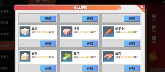 这些食材都可以在【寻宝之旅】玩法中获取,不同的食材需要站在不同的玩法中获取,其中: