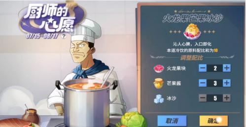 《航海王热血航线》游戏中,厨师的心愿活动需要玩家制作火龙果芒果沙冰,很多玩家还不清楚制作配方是什么。接下来就让小编给大家带来航海王热血航线火龙果芒果沙冰配方介绍,感兴趣的小伙伴们一起来看看吧。
