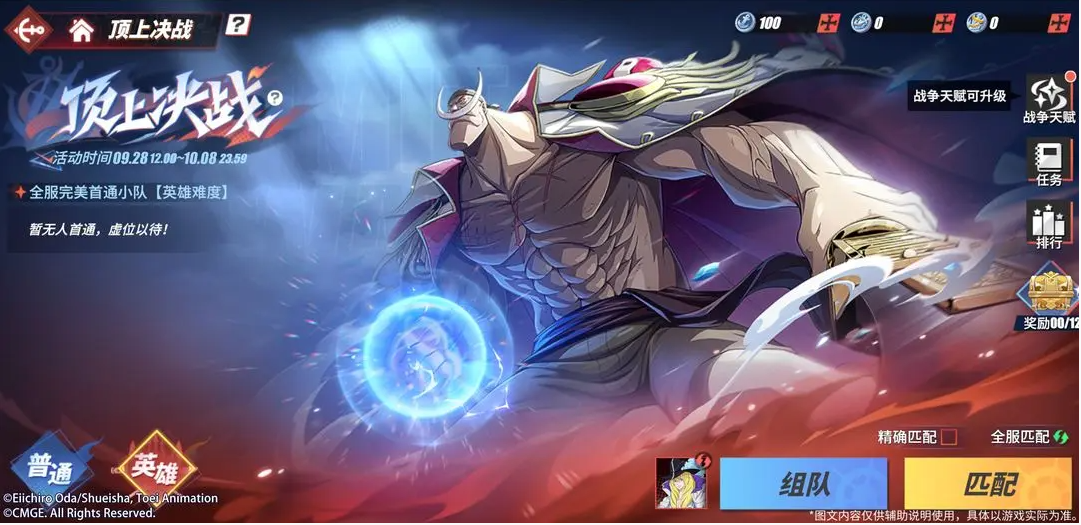 -活动期间,等级≥20级的船长可以前往游戏右上角-顶上决战界面,组成四人小队自由探索大地图,参与战斗。