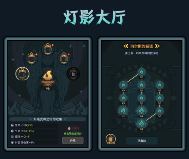 目前在灯影大厅中有着四盏神灯与一株女神之树。升级女神之树可以直接给提灯者自身带来属性加成,而每一盏神灯则有着其独特的属性,将会在不同时候助提灯者一臂之力;