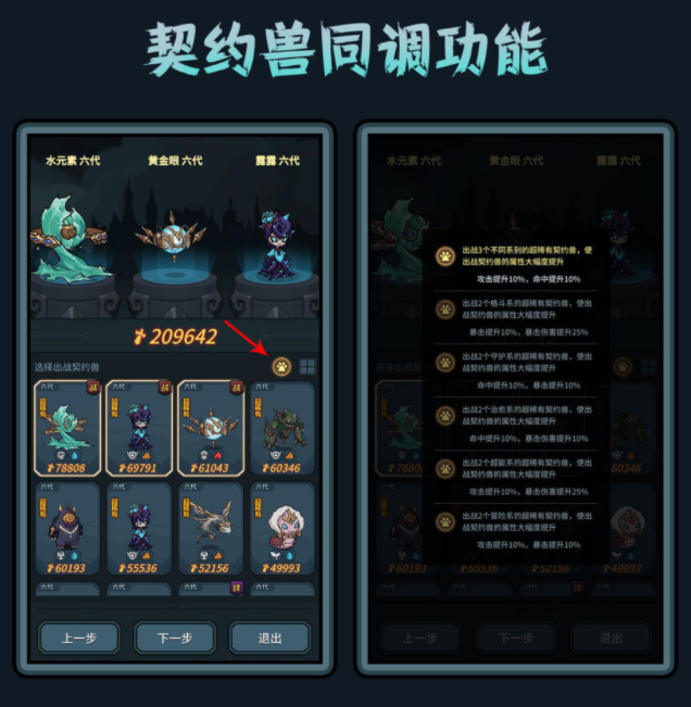 玩家在通关初心试炼–【利爪蛇巢穴】后,将开启契约兽同调功能。提灯者可以在契约兽出战界面,选择不同系别的契约兽,触发属性增强效果,获得属性提升的契约兽,将更好的助力提灯者深渊探险~