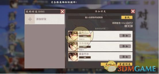 通过点击主界面右下角的好友,进入好友界面,再通过添加好友输入想要添加的好友的名称或ID,即可申请添加好友。