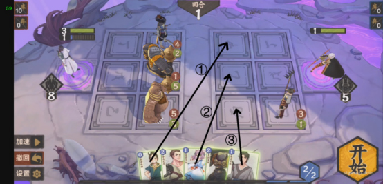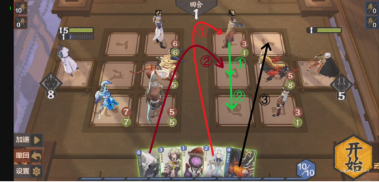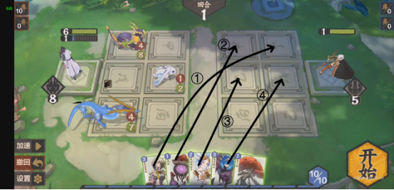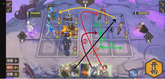 通过观察可以发现,这一个残卷我们是不可能打到对手脸上的,不过由于对手场上有三个食人树让对面慢性死亡,所以这一局只要保证自己的英雄和对手的食人树不死就赢了,对手的狻猊能让正面生物变成(X1Z),己方战神(488)存活时间短,所以要用后排的武者移到上路,为了利用战神,需要让他去中路防守。为抵御蜘蛛,需要武士正面碰,后排需要俩杀不死食人树的将武者顶上去,位置任意。