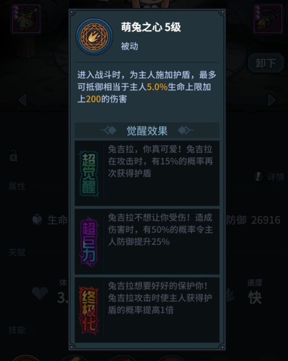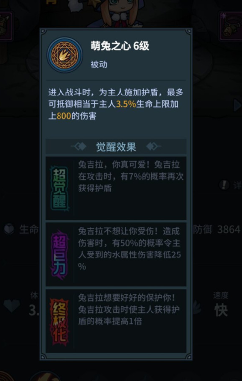1、基础:兔吉拉在投入对战以后,会替主人增添护盾,最多能抵御相等于主人3%生命上限+50的伤害。