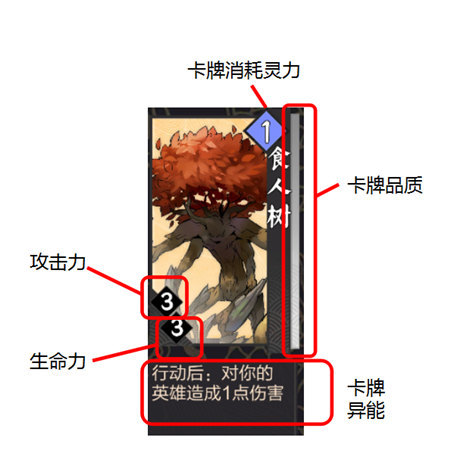 生物卡被翻开时,可召唤对应的生物到场上,为玩家进行战斗。它们拥有自己的生命值、攻击力以及异能,当血量变为0以下时就会消灭。除非有“冲锋”异能,否则生物牌被召唤的当前回合不能进行攻击。生物拥有不同的异能,也有部分生物为没有效果的白板。
