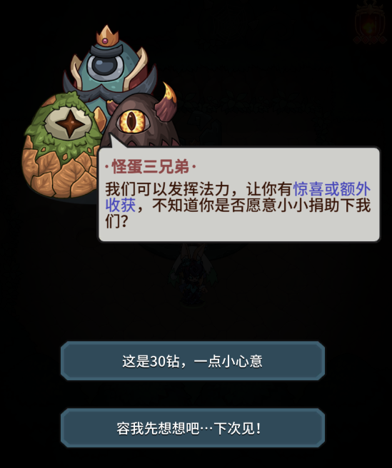 1、进入怪蛋岛会有三个怪蛋奸商看着你,捐助他们会有特殊效果,需要花费30钻你就可以获得30%移动速度快速遨游迷宫,也有很多好的BUFF。