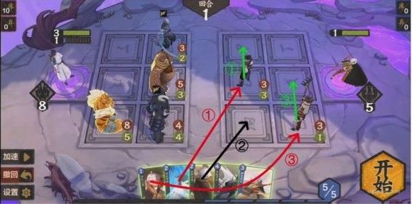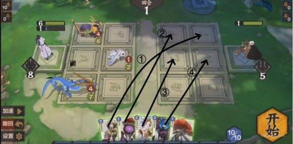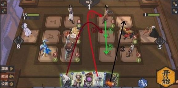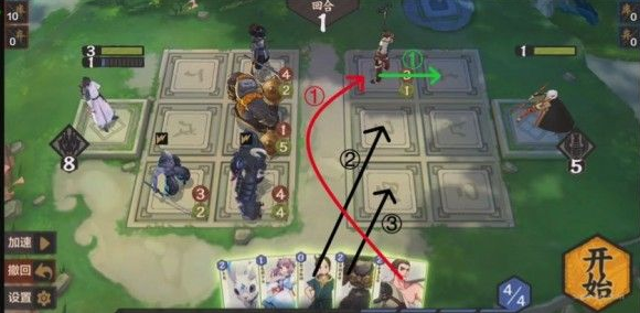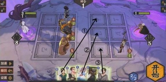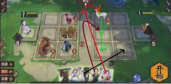 本关需要巧妙使用法术。通过对局势的观察发现,我们必须从上路或中路破敌,同时3灵和4灵法术消耗太大,肯定不能使用。所以应当从其他的法术卡里想办法,如果要从上路破敌,显然是不现实的,因为至少需要在后排放上两张卡,导致卡不够用,所以采取中路破敌,上路就利用某张法术将(233)推上去,中路利用某张法术将(131)推上去同时在场的一张法术保证其不死,同时将(444)抵挡住又需要一张法术(注意幼时之盟会抽卡暴死,所以一定要在其翻开之前结束战斗,指定随机),思路如下: