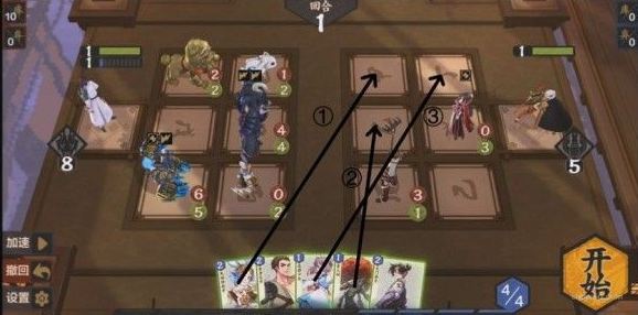 本关初步介绍光环效果,通过对关卡的分析可知,我们必须要解掉成体斗魔(444)嗜血,否则就会被一路打穿,同时要注意己位的威胁,显然,我们的卡中没有能够解决己位的,所以我们一定要在之前解决掉对手,观察手牌,发现能解掉中路威胁的是(231)与(133),由于灵力问题,选择(133),食人树死亡后自己不会掉血。之后将上路与中路情况比较,得到我们需要通过已准备好的随从从中路破敌,所以应该在丁位放柔弱少女(112)对戊位加成,同时利用神射手(202)防守对面的爆裂傀儡(222)使其不死,解法如下: