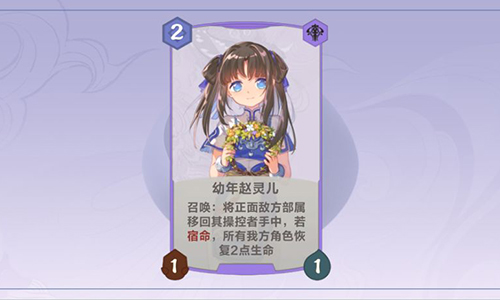 此卡牌召唤即可退回一名正面敌方部署,触发宿命效果还可给全场加血,只要预判靠谱,运气在线,我们的小灵儿,你值得拥有!但是灵儿命还是有点脆的,为了避免当年悲剧重现,还是多用几个血厚小伙挡挡攻击吧~