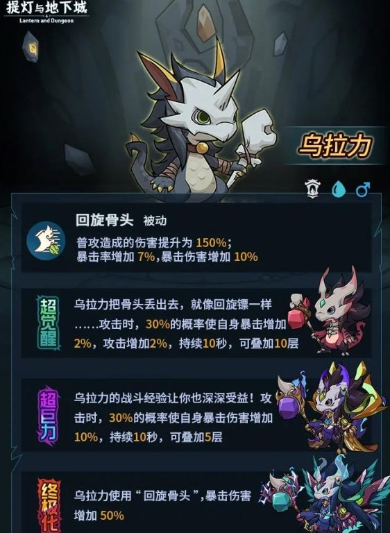 超巨力:攻击时,30%概率使自身暴击伤害增加10%,持续10秒,可叠加5层。