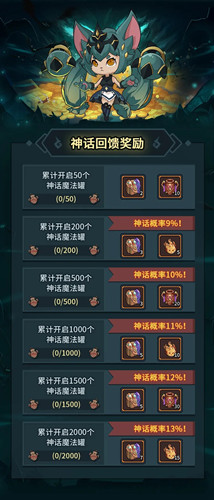 活动期间,神话契约兽初始概率为 8%,累计开启神话魔法罐达到指定次数,即可领取资源奖励,并可提升概率,最高可提升至13%噢~
