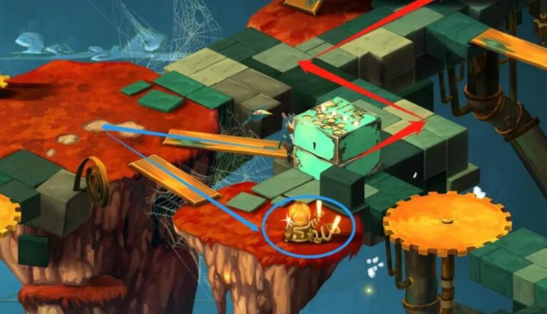 从木板上过去,拿上橙色电池,把箱子推到前面去(红色箭头)