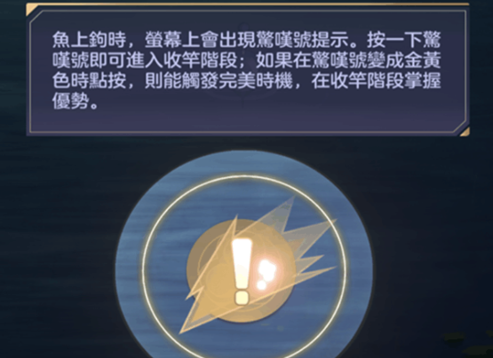 开始钓鱼后点击屏幕可以进行抛竿,当屏幕出现上钩提示时点击收杆,如果超过时间未收竿则钓鱼失败,出现最佳时机提示时点击屏幕可以提升收杆进度条的速度。