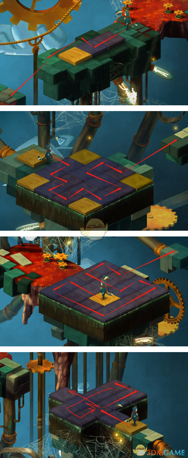 除黄色方块外全部点亮,打开通道,黄色方块清空全部方块,可以来回踩 不止一种解法,解法也不唯一,可以来回踩