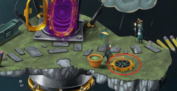 捡起齿轮,从楼梯下来,往左边走,放上齿轮,顺着这条路到下个区域发条镇,一直走到前面没路了,往左上走,捡起蓝色电池,从另一边过来,回去放上蓝色电池