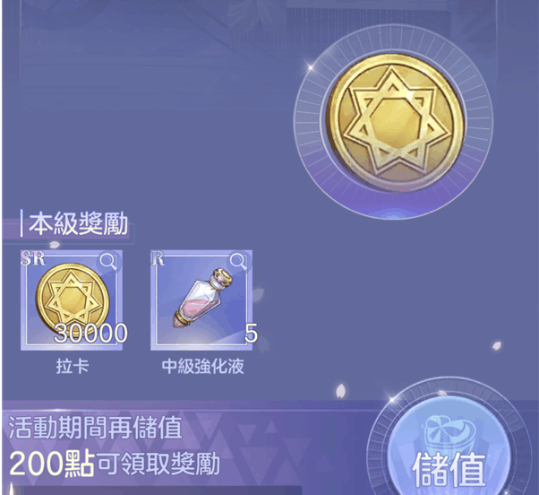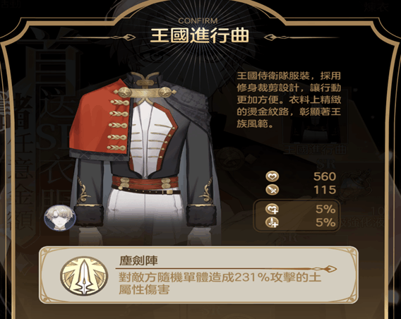 除了首次充值额外奖励的幻水晶外,第一次充值无论充值多少还会获得首充奖励,奖励共有四个,sr服装王国进行曲1件、10个高级强化液、10个高级思念精华、10000拉卡。Sr级服装王国进行曲是国王侍卫队服装,只有阿贝尔可以穿着。