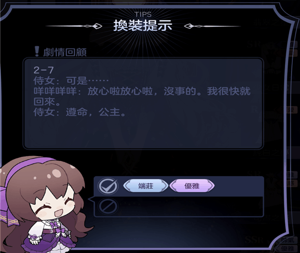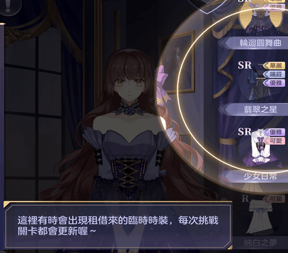 在主线剧情中会遇到特定要求的换成,如需要女主角更换优雅端庄标签的衣服进行剧情,这时就会进入限时换装环节。