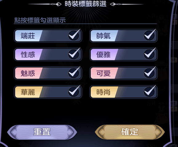 服装标签分为帅气、优雅、魅惑、典雅、华丽、时尚、可爱等标签,玩家根据换装要求选择满足条件的服装。玩家可以点击右边服装栏中查看服装标签情况。也可以直接选择标签进行筛选,选出最符合要求的衣物。