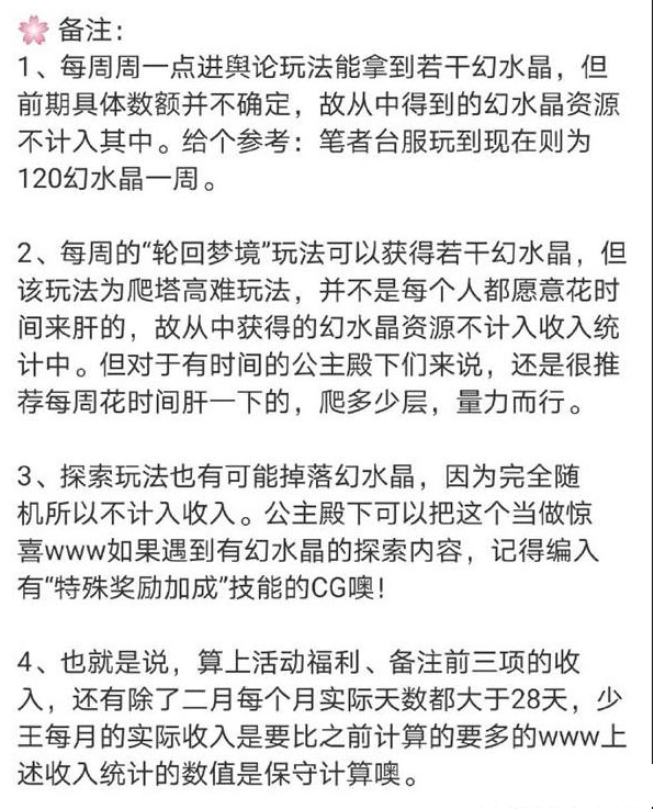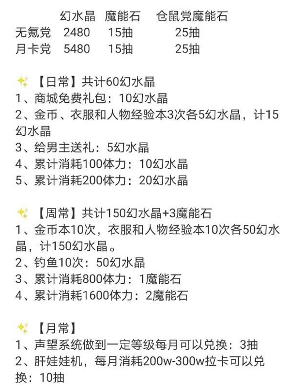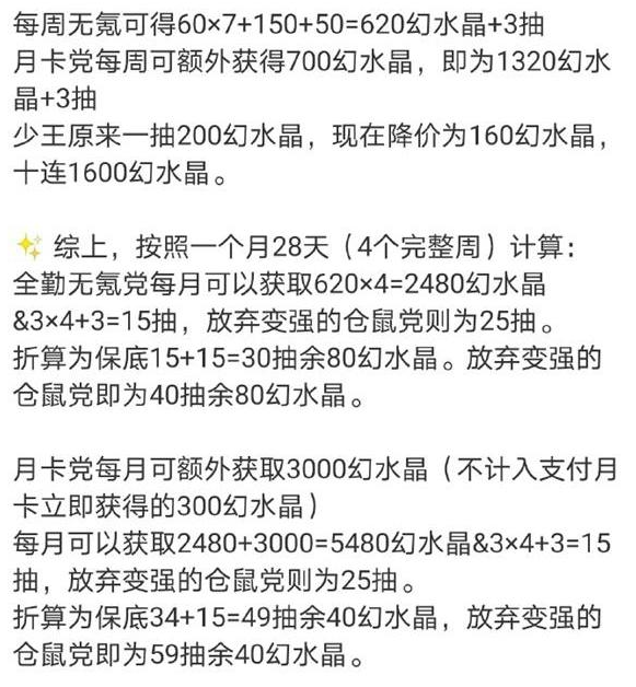 全勤无氯党每月可以获取620×4=2480幻水晶&3×4+3=15抽,放弃变强的仓鼠党则为25抽。