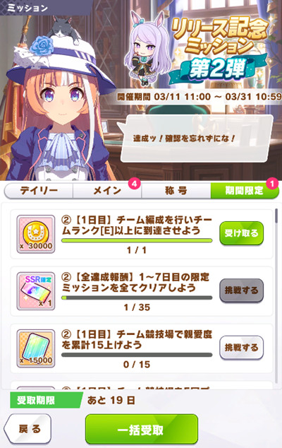 从3月11日 12:00(日本时间)开始,每天都会有新的期间限定任务,一共7天,会在任务界面出现相关的限定任务