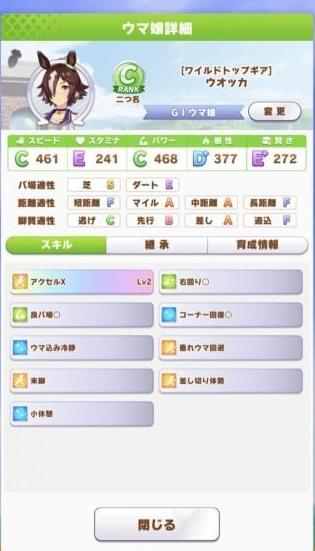然后是技能,我个人认为差马最重要的技能是蓝色的回复体力技能,触发率很高,差马前中期一直是跟跑,体力消耗不大,配合回复技能可以在终盘时满体力冲刺;