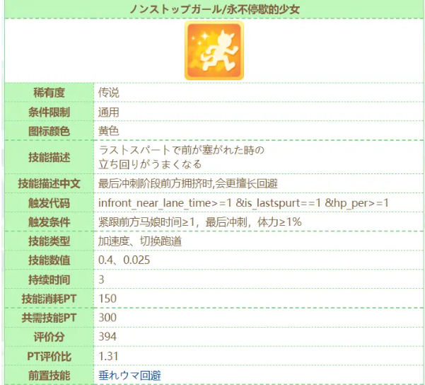 泛用性:极强。不限制发动名次、跑法和位置,非逃马都可以带(逃马带了也很难赢)。