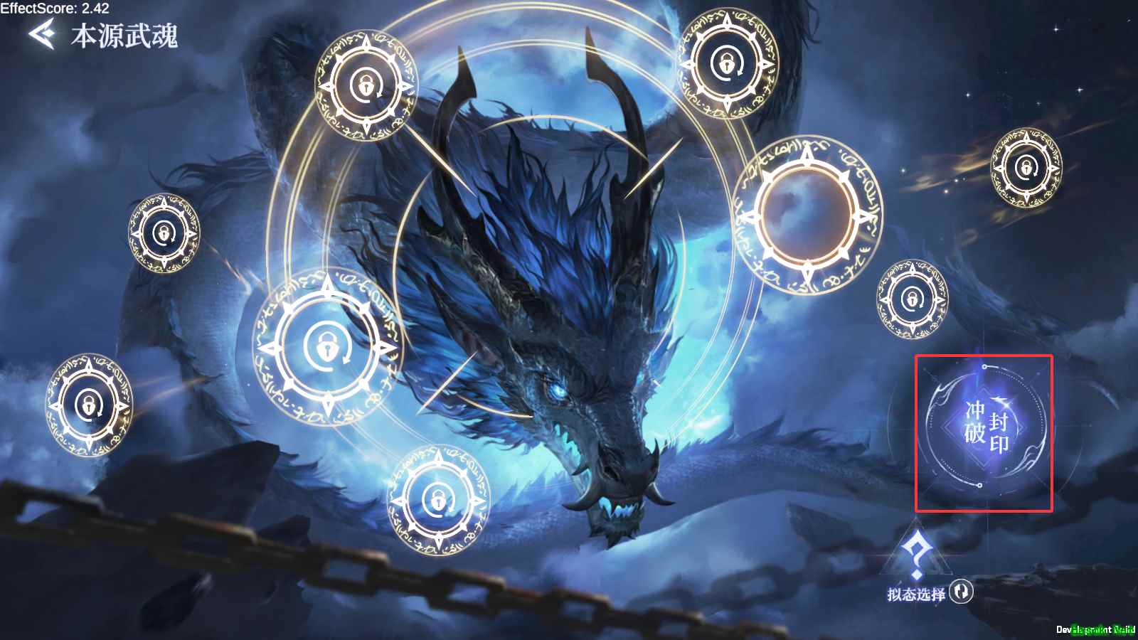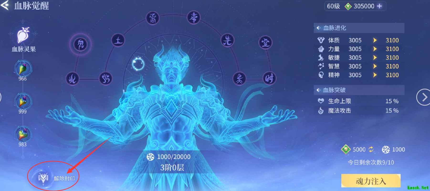 1.完成主线任务“龙神降临”(完成第六章主线任务,开服第9天,等级47级)后,在血脉中点击【解除封印】进入本源武魂界面;