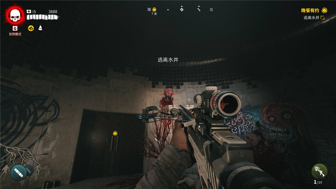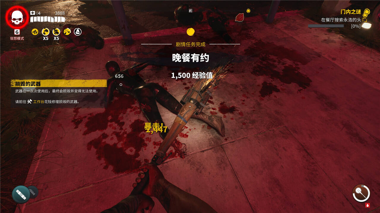 大门开启之后,顺着任务点前往餐厅,在餐厅击败带着猪头面具的破坏者即可完成“晚餐有约”任务(击败破坏者之后会刷新大量的焚烧丧尸,全部清理完即可)