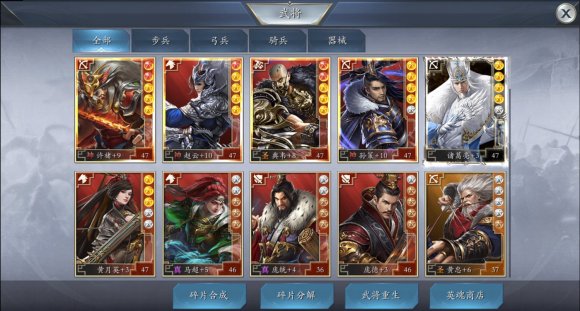 武将可以通过高级招募、碎片合成以及在英魂商店购买充值礼包获得,武将碎片可以在英魂商店、竞技商店、精英副本获得。武将通过升级,升星,进阶,佩戴装备,侍女,兵法,主城皮肤等方式培养提升战力。