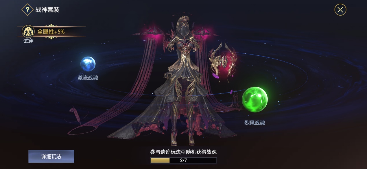 在遗迹中肝任务,可以获取七色战魂,用来解锁战神套装。