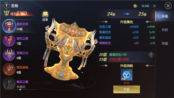升级需要消耗圣灵石,是圣物系统最直接的养成系统,玩家只要解锁了圣物并且具备足够的圣灵石就能够进行升级。