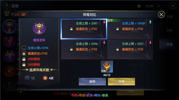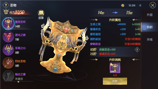 升阶是圣物提升比较慢的一个系统,因为每一种圣物的提升都需要碎片,而圣物的碎片并不能够非常稳定地大量获得,但是升阶非常重要,因为圣物的升阶影响到淬炼的槽位。因此这个系统需要玩家慢慢培养,但是一定不能落下。