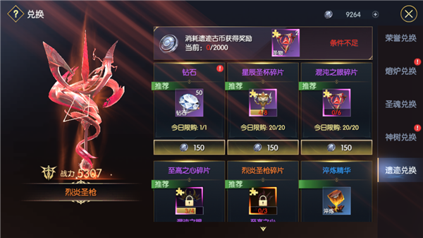 圣物的碎片和培养材料通过遗迹和商店就能兑换绝大部分,等级和阶位是圣物提升的重中之重,淬炼则非常看运气,准备大量的淬炼精华才是根本。
