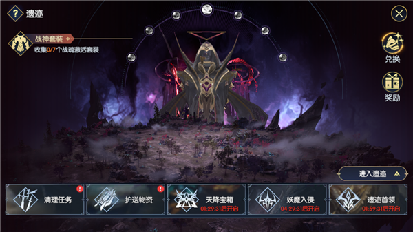 遗迹玩法是游戏之中最主要的圣物及相关培养材料的获得途径,玩家每天都能够参与到遗迹玩法之中,参加清理任务、护送任务以及天降宝箱、妖魔入侵、遗迹首领三个限时玩法。